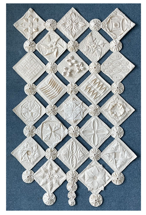 Play with different 6” manipulated textural blocks. Easy to cut, fun to fiddle, no awkward templates, just squares and rectangles for the most part. Embellish and decorate the designs however you fancy. Use the blocks for quilts, wall-hangings, bags, cushions and even clothes. Play, expand and explore the many options presented. Or just come and do your own thing!